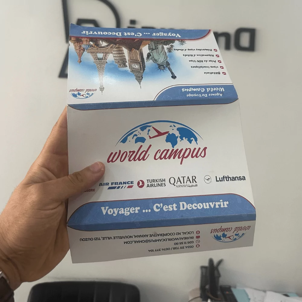 Dans le cadre de sa campagne de promotion des études à l’étranger, World Campus a souhaité offrir à ses futurs étudiants un porte billet d’avion personnalisé. Ce support, à la fois utile et esthétique, reflète l’image professionnelle de l’établissement tout en accompagnant les étudiants dans leurs déplacements.