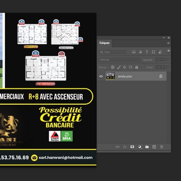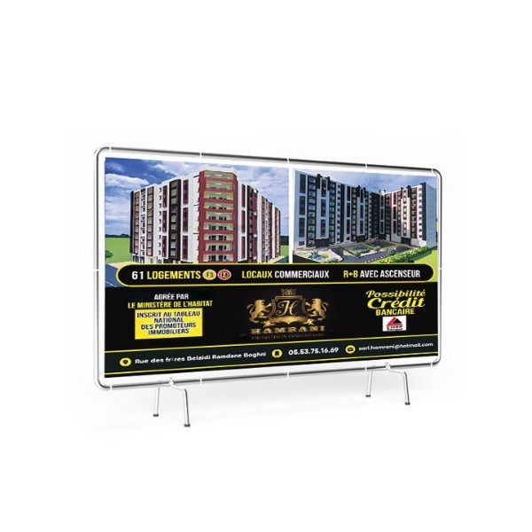 Pour valoriser ses projets immobiliers et renforcer sa présence visuelle, la Promotion Immobilière Hamrani a confié à Diamond Agency la conception graphique et l’impression d'un panneau publicitaire au format 2m x 1.50m.