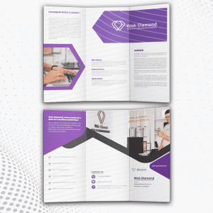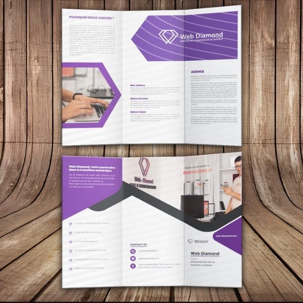 Nous avons conçu un dépliant sur-mesure pour Web Diamond, une agence web en France spécialisée dans la création de sites internet, le marketing digital, la gestion des réseaux sociaux et la conception graphique.