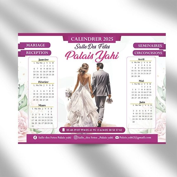 En plus d’être un outil pratique pour noter les rendez-vous, ce calendrier devient un véritable outil de communication, renforçant la présence de la Salle des Fêtes Palais Yahi auprès de ses partenaires, futurs mariés et organisateurs d’événements.