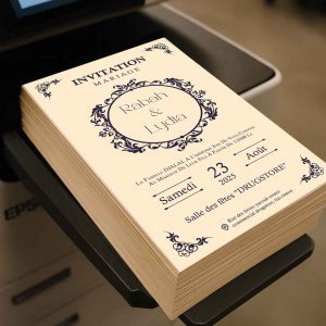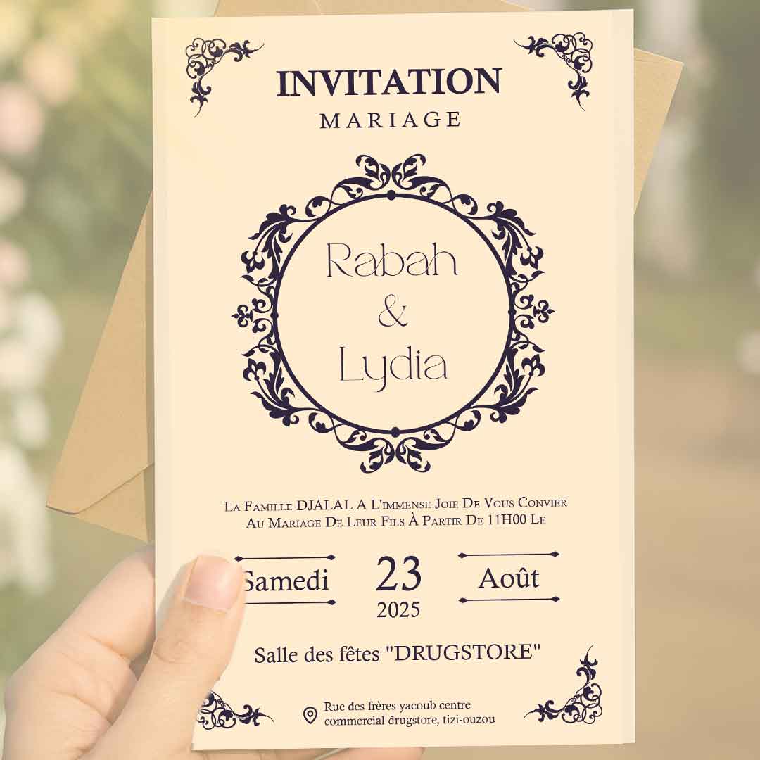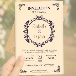 La carte d’invitation mariage est le premier reflet d’un grand jour, elle annonce l’événement avec style et élégance. Pour le mariage de Rabah & Lydia, notre équipe a conçu et imprimé une carte personnalisée au design raffiné, avec une typographie élégante et des motifs décoratifs harmonieux.
